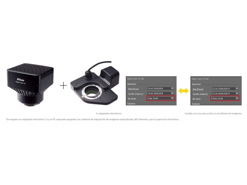 La Digital Sight 10 permite cambiar fácilmente el modo de color, ya sea de forma electrónica o manual, mediante el uso de un software de adquisición de imágenes especializado para el cambio electrónico o la conexión/desconexión de filtros en la ranura en la parte inferior de la cámara del microscopio para el cambio manual.