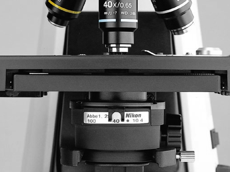 El condensador* viene con un diafragma de apertura con marcas de guía de posición para cada magnificación de objetivo para hacer que las operaciones sean rápidas y fáciles, adicionalmente a esto también es enfocable para brindar imagenes con mayor profundidad de campo y contraste.