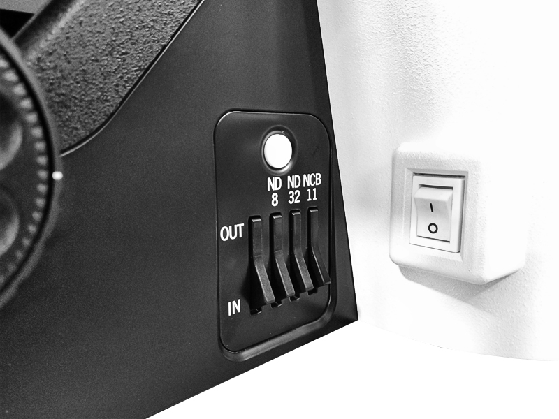 Este modelo cuenta con un sistema de filtros incorporado al estativo: ND8 Y NCB11, que nos ayuda a mejorar la imagen aplicando estos filtros en el trayecto de la iluminación