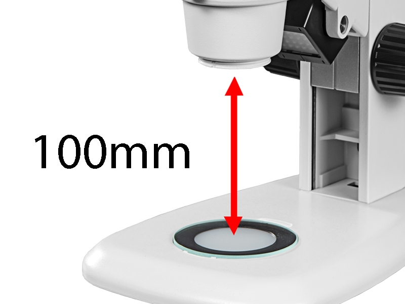 La larga distancia de trabajo de 100mm le permite un enfoque seguro incluso con especímenes que tienen superficies notablemente disparejas. Esto es de gran utilidad cuando se usan pinzas, herramientas de disección o una pipeta durante la manipulación del espécimen.