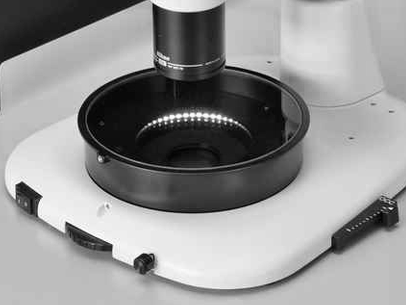 Este soporte que va encima de la base pemite realizar campo osuro en el estereomicroscopio, tiene un mando con interruptor de encendido / apagado y regulador de intensidad con sistema electrico multivoltaje (PLUG & PLAY). Este exclusivo y nuevo soporte incorpora LEDs de alta intensidad.